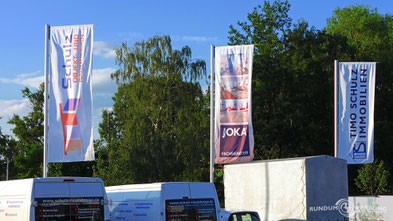 Fahnen in den Standartgrößen von 80 x 200 cm bis 150 x 500 cm und Qualitäts-stufen in Sachen Luftdurchlässigkeit und Reissfestigkeit. Digital bedruckt nach den vier Farben der Euroskala.